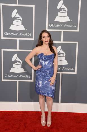 Mejor Vestidas. Kat Dennings eligió este estilo de Vivienne Westwood en color azul, para su presentación durante los premios Grammy 2013. Un strapless azul y blanco, a la rodilla, con un complejo diseño sobre el pecho que la hizo lucir elegante y de muy buen gusto.