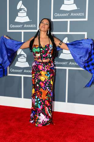Peor Vestidas. Otra de las celebridades que llenó la alfombra roja de color fue Lila Downs, para quién no bastó la infinita paleta de su traje enterizo de pantalón, con estampado autóctono de su país, un estilo muy llamativo, que no le hizo honor a la gala, sino que lo acompañó con un sobretodo azul con negro y blanco, muy típico, que recargaba aún más su atuendo.