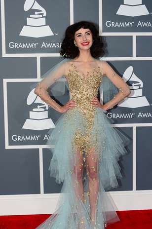 Peor Vestidas. Este recargado diseño de Jaime Mayor, fue la elección de Kimbra para deslumbrar en esta gala. Un diseño entallado al cuerpo, recargado en tul y pedrería de color oro que la hacía parecer en un disfraz de un cuento de hadas.